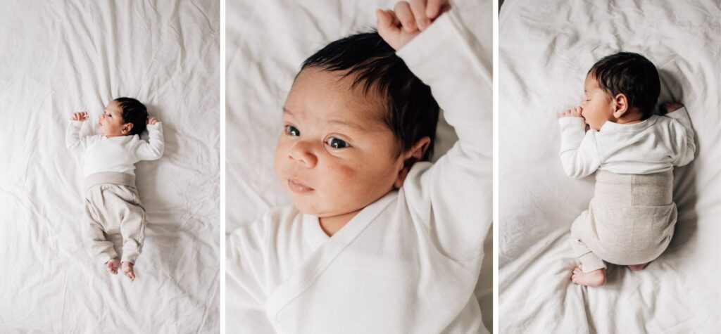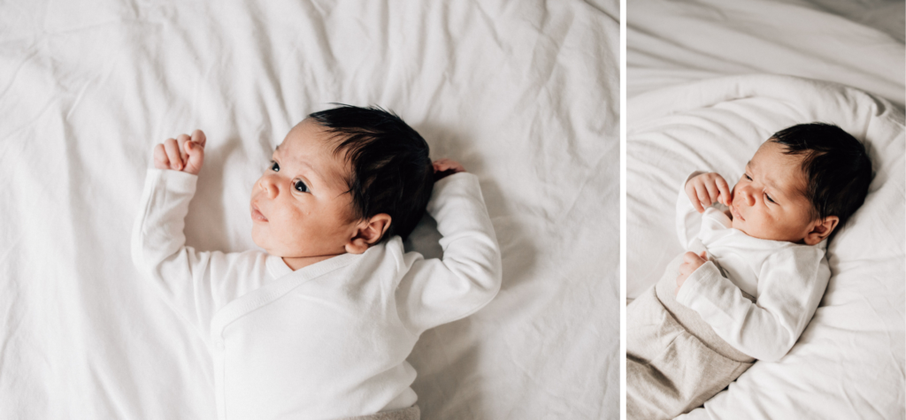 Wenn dein Baby wach ist für die Fotos, leg es am besten einfach auf den Rücken und lass es sich frei bewegen. Achte darauf, dass das Gesicht zum Fenster gerichtet ist. So erhältst du lebendie Bilder, die das einzigartige Temperament deines Kindes zeigen. Drehe es auch mal auf die Seite oder auf den Bauch für etwas Abwechslung bei deinem Babyshooting. Wenn dein Baby schläft, kannst du natürlich auch etwas mehr Einfluss darauf nehmen, wie es genau liegt oder wo die Händchen sind. Ausserdem gibt ein Stillkissen unter der Decke zusätzlich noch etwas Halt.