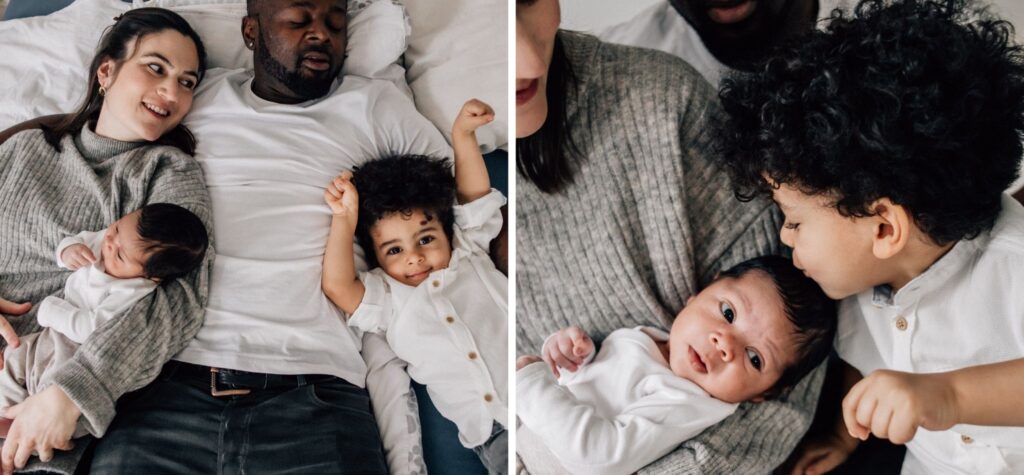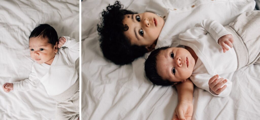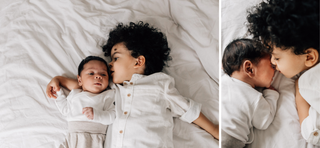 Die Geschwister sind meistens neugierig und wollen sehen, was du da machst. Lass sie am besten beim Babyshooting dabei sein und fange die schönen Momente ein, wenn sie mit dem Baby kuscheln oder es beobachten. Im Liegen ist es am sichersten, wenn die Geschwister selbst noch klein sind. Ich habe auch die Erfahrung gemacht, dass selbst zuerst uninteressierte Geschwister sich dann meistens aus Neugierde daneben legen und daraus Fotos voller echter Emotionen entstehen. Im Sitzen können auch Kissen beim Stützen hilfreich sein.