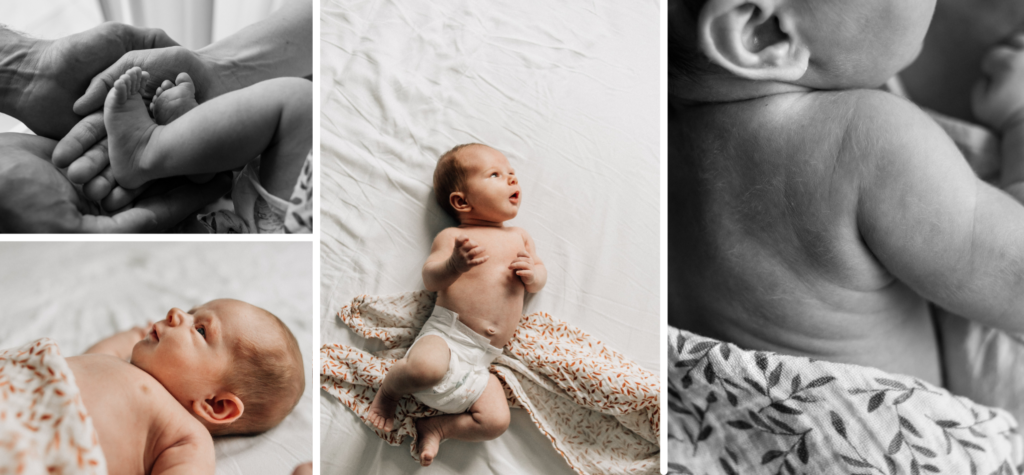 Ich richte mich beim Babyshooting Zuhause ganz nach eurem Baby und passe einen geeigneten Moment ab, um ein paar Portraits von eurem kleinen Schatz zu machen. Dabei liebe ich es auch die kleinen Details festzuhalten, die so einmalig für die Neugeborenen-Zeit sind. Die Babyfotos entstehen oft im Elternbett, wo es sicher ist und sich die Eltern dann auch dazu kuscheln können. Wenn das Licht sich an einem andern Ort in deinem Zuhause besser dafür eignet, richten wir dort ein kleines Plätzchen für dein Baby ein.