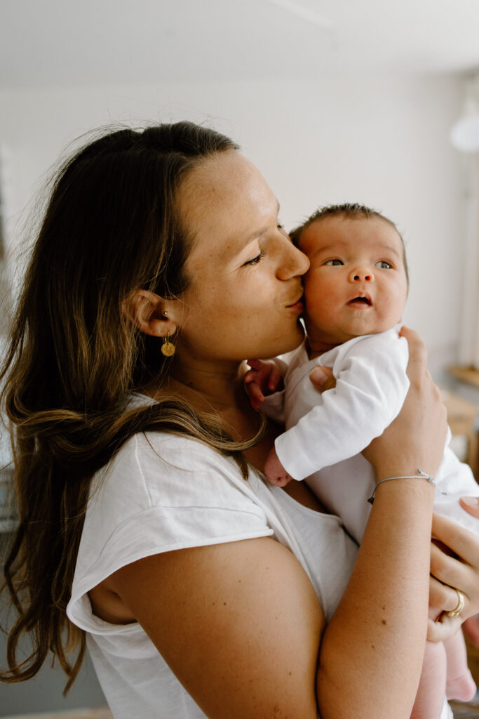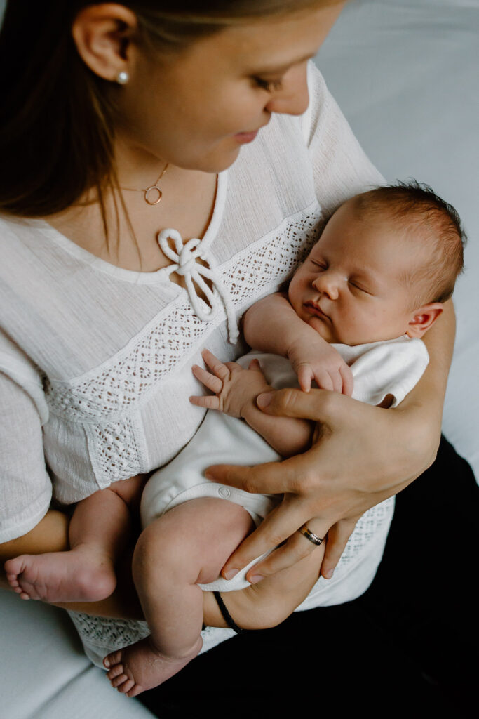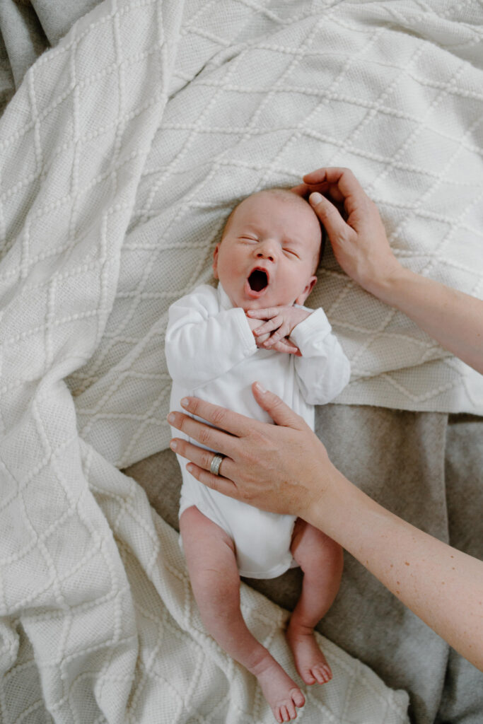 Die typischen Eigenschaften von einem Neugeborenen hat ein frisch geborenes Baby in den ersten 5 bis 10 Tagen. (Natürlich ist es das auch schon am ersten Tag, aber wie auch wir nach einem Umzug etwas Zeit brauchen zum Ankommen, so geben wir diese natürlich auch eurem Neugeborenen – und dir, du Heldin!). In den ersten Tagen schläft es viel, ist noch nicht weit von seinem Geburtsgewicht entfernt und ist noch sehr verträumt. Wahrscheinlich wird es auch während dem Shooting noch mindestens eine Mahlzeit brauchen. Dazu nehmen wir uns natürlich die Zeit. Ich plane für Neugeborenen-Shootings 1-2 Stunden ein, damit wir ganz entspannt Zeit haben. Euer Baby gibt den Rhythmus vor und ich fotografiere eure Zeit im Wochenbett und mache natürliche Portraits von eurem kleinen Schatz.