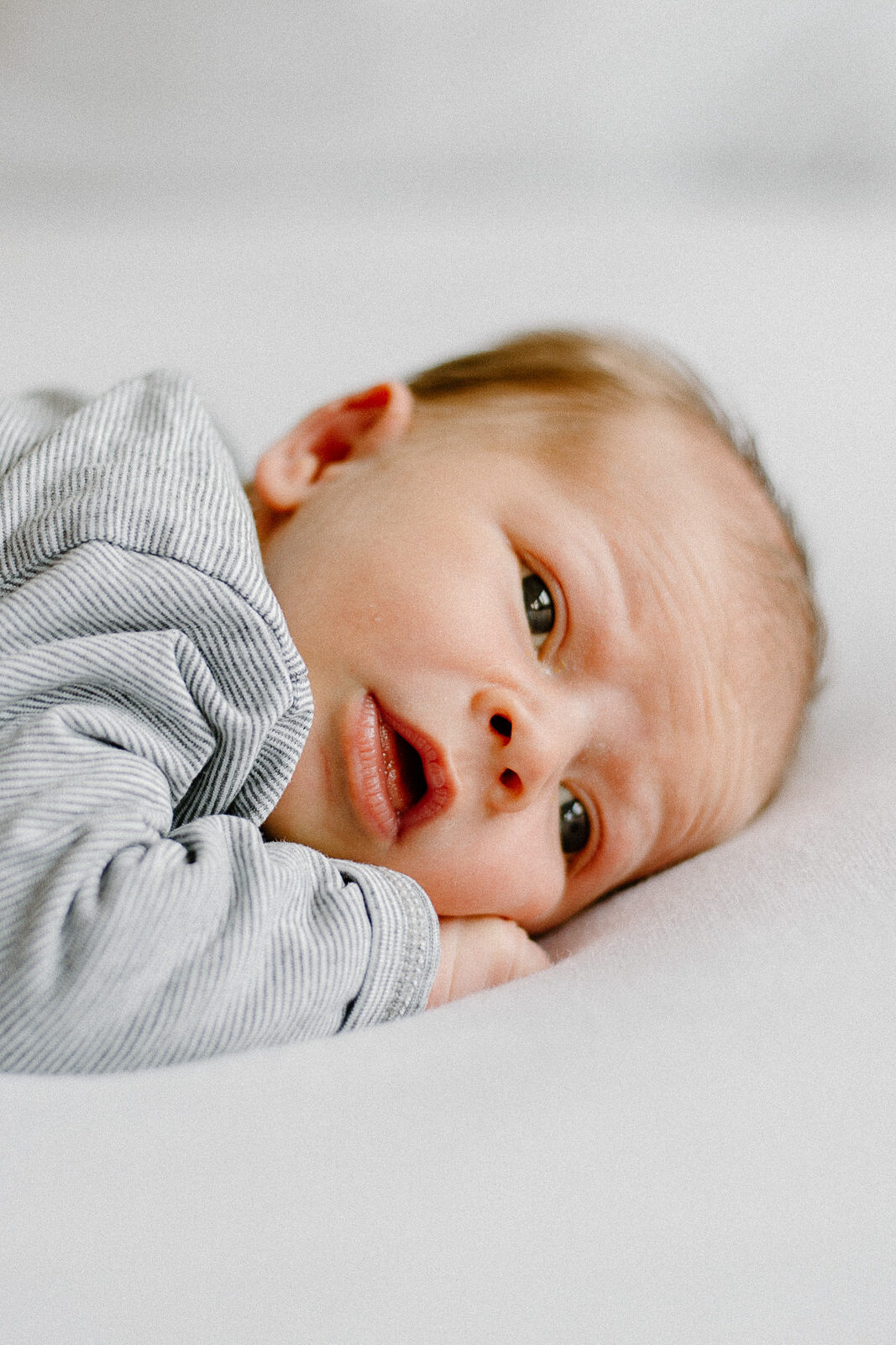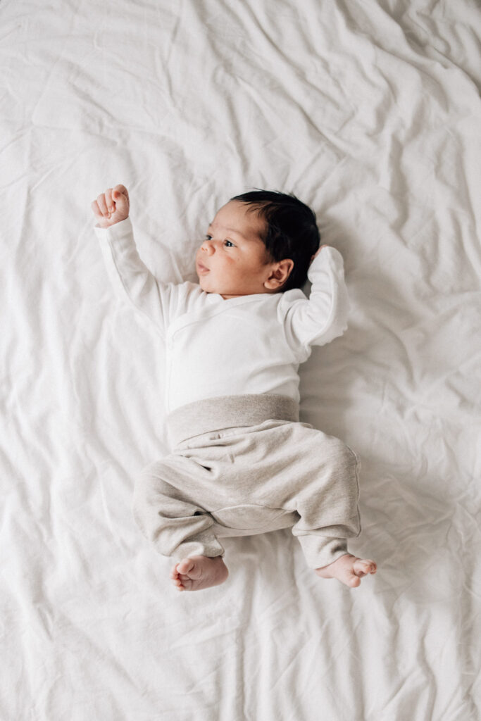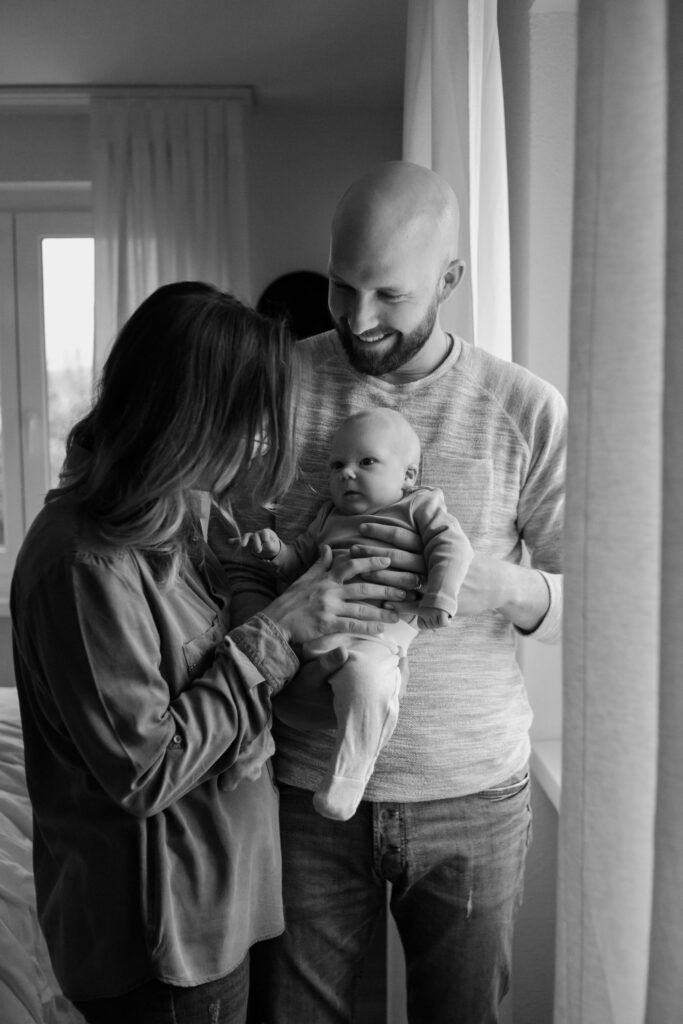 Euer Baby hat hoffentlich schon fleissig zugenommen und nimmt seine Umgebung sicher schon viel neugieriger wahr. Manche Babys halten ihr Köpfchen auch schon ganz kurz, manche sind immer noch richtig verträumt. Ob wach oder am schlafen ist für meine Art von Fotografie nicht entscheidend. Ich dokumentiere unsere Zeit zusammen, genau so, wie sie ist. Euer Baby wird bei mir nicht in bestimmte Posen gelegt und muss auch nicht still halten. Ich finde es immer wieder faszinierend, wie schon so kleine Babys ihren ganz eigenes Temperament haben und freue mich, wenn das auf den Fotos zum Ausdruck kommt.